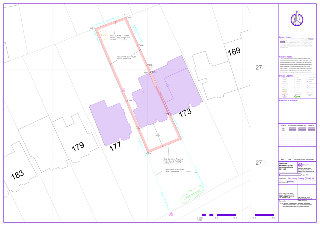 We carried out a detailed boundary survey at the property, combining on site measurements with a review of relevant Land Registry information and historic mapping data.